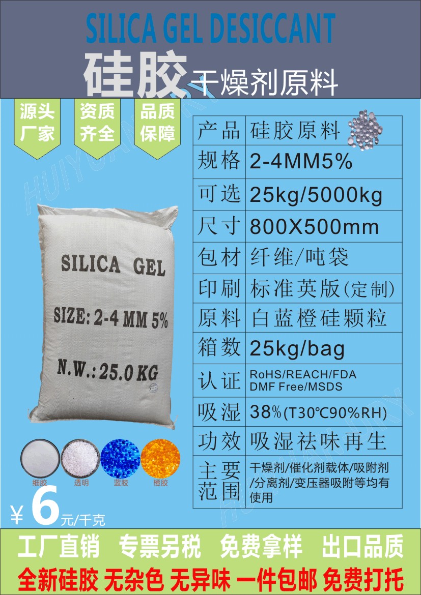 硅胶干燥剂是一种高活性吸附材料,通常是用硅酸钠和硫酸反应并经老化,酸泡等一系列物理处理过后而制得。硅酸属于非晶态物质,其化学分子式mSiO2.nH2O,不溶于水和任何溶剂,无毒无味,化学性质稳定,除强碱、氢氟酸外不与任何物质发生反应。各种型号的硅胶因其制造方法不同而形成不同的微孔结构。硅胶的化学组成和物理结构,决定了它具有许多其它同类材料难以取代的特点:吸附性能高、热稳定性好、化学性质稳定、有较高的机械强度,无毒、无味、无污染。产品的质量标准符合中国化学标准HG/T2765.1-96和中国军用标准GBJ2714-96。