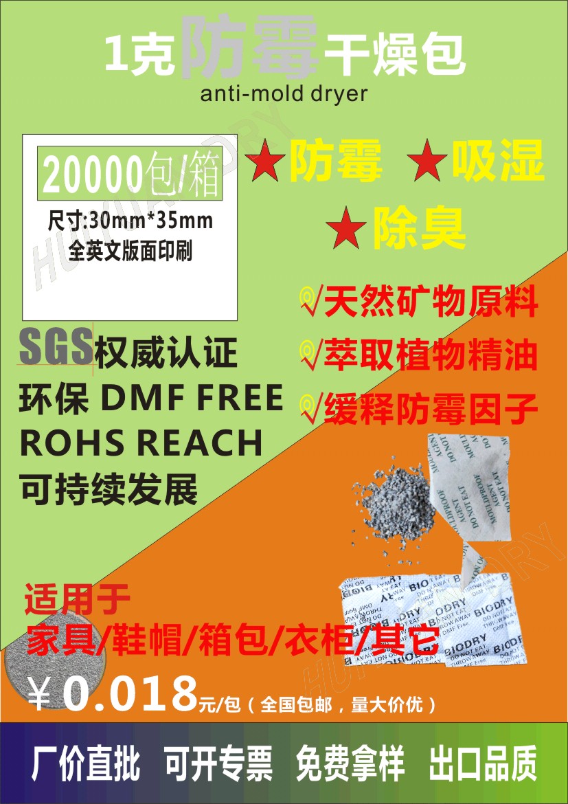 防霉抗菌剂是以天然化学性能稳定的矽酸铝纳米防霉阳离子为吸湿载体,遇到空气中的潮气主动释放抗菌因子,真正做到有效释放,适用于包装内/密封空间的防霉抗菌后处理。可自然降解,属环保型防霉抗菌剂。在室温及一般湿度下吸附性能高,具有吸附活性,饱和吸湿率可达自身重量的300%(25℃,RH=100%),是普通硅胶干燥剂的10-20倍,有效控湿时间90天。有静态减湿和异味去除等功效。包装材料采用吸湿性强的棉纸材料,韧性好、抗刺穿、耐腐蚀,无返渗、抗静电。