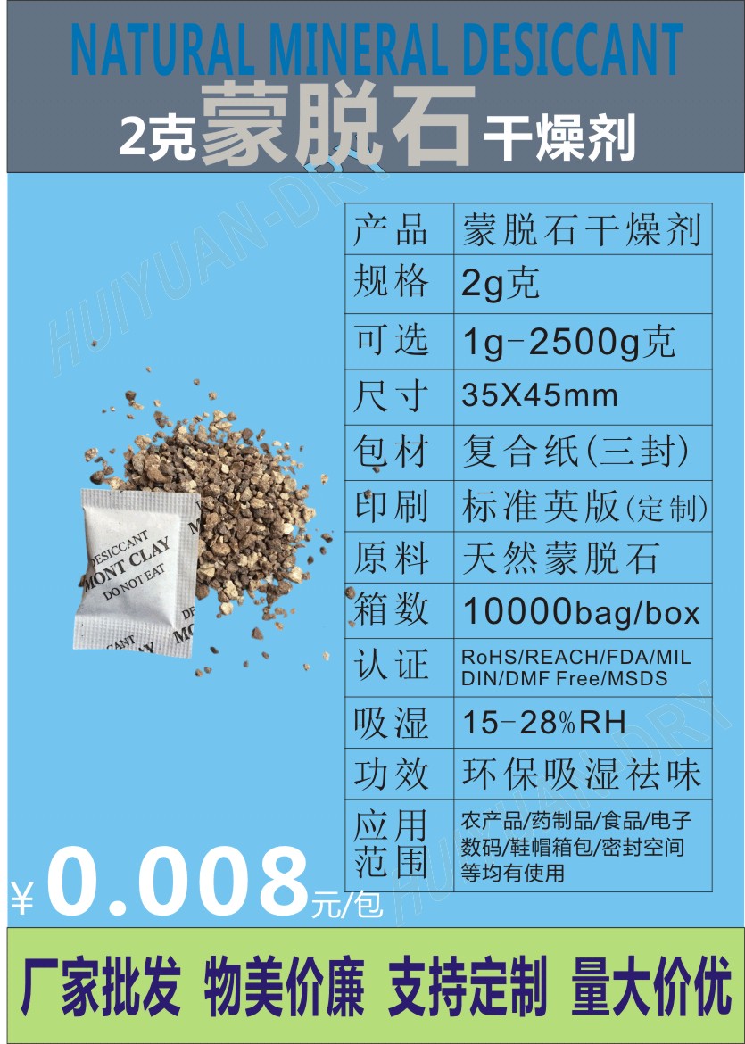 由天然的蒙脱石矿开采后经高温加热,有机质碳化,蒙脱矿体膨化,蒸气处理,烘干干燥、活化、破碎、过筛精选而成。是一种天然的、无毒的、无公害、可降解性的健康绿色环保干燥剂,不含任何添加剂和没有腐蚀性物质,也没有氯化物,产品质量标准符合中国军用标准GJB2714-96和美国军用标准MIL-D-3464-E。