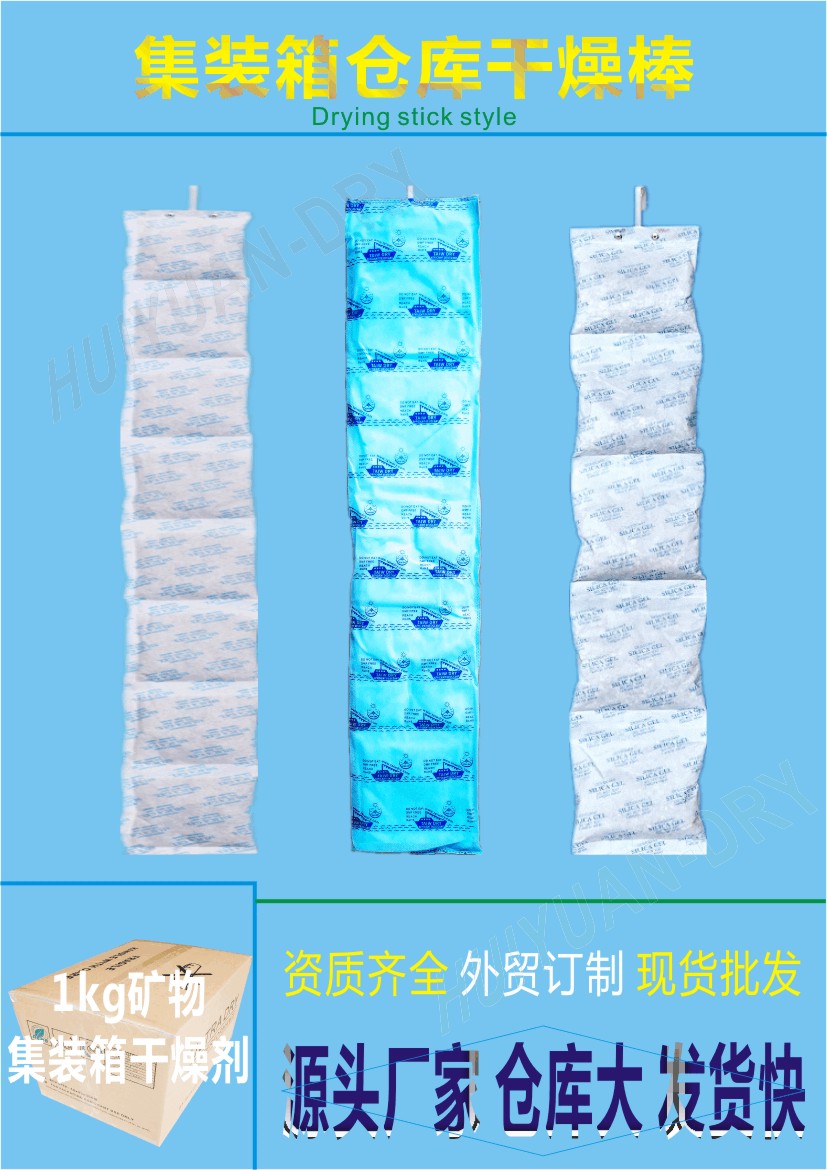 矿物集装箱干燥剂,又叫矿物货柜干燥剂,以矿物为主要吸附成份,形状有以带挂钩的干燥棒、带挂钩的干燥袋、不带挂钩的干燥包等等,是集装箱海运专用干燥剂最为常用的一种。带挂钩的集装箱干燥剂,钩挂在集装箱壁上部挂环使用的防潮剂,在货物集装箱装载海运过程中,保持货柜内部干燥,预防货柜雨形成,从而起到保护货物海运时纸箱等外包装不因受潮而引起货损的针对性很强的专用干燥剂。同时对金属机器货柜运输吸附盐雾防锈也有很好的效果。